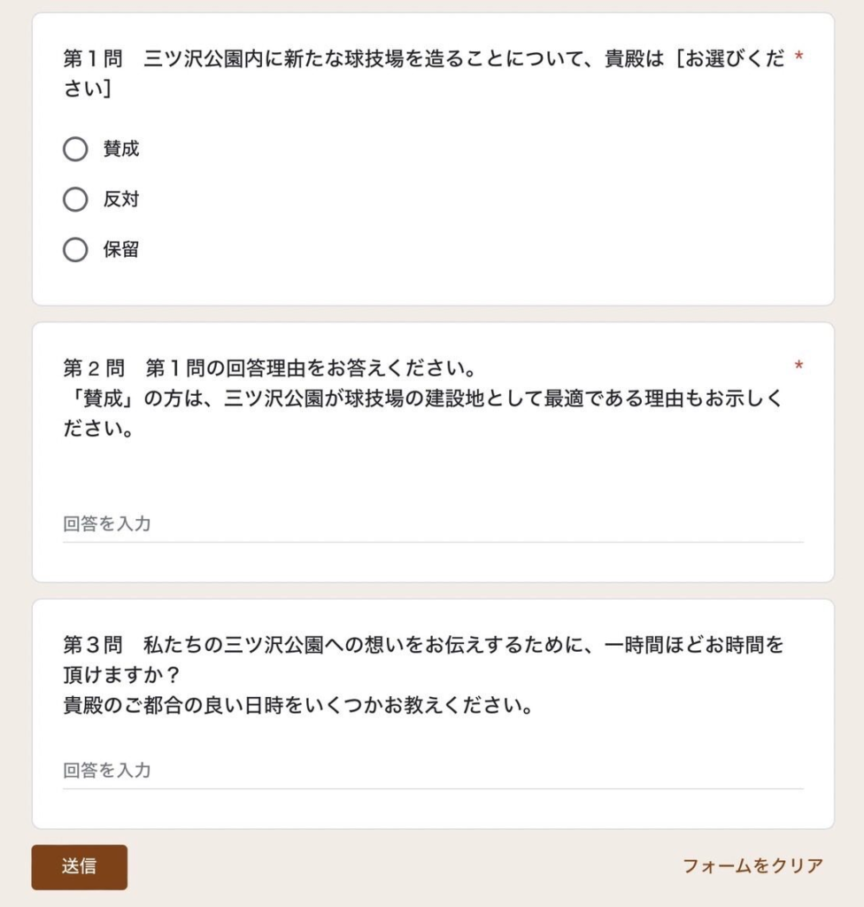つきましては、三ツ沢公園内に新たな球技場を建設することについて、市会議員の皆さま全員にお考えを伺いたく、公開質問をさせて頂きます。ご多忙のところ恐縮ですが、下記サイトにアクセスのうえご回答ください。
